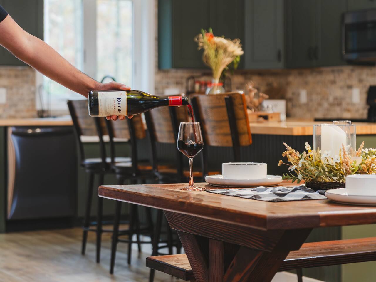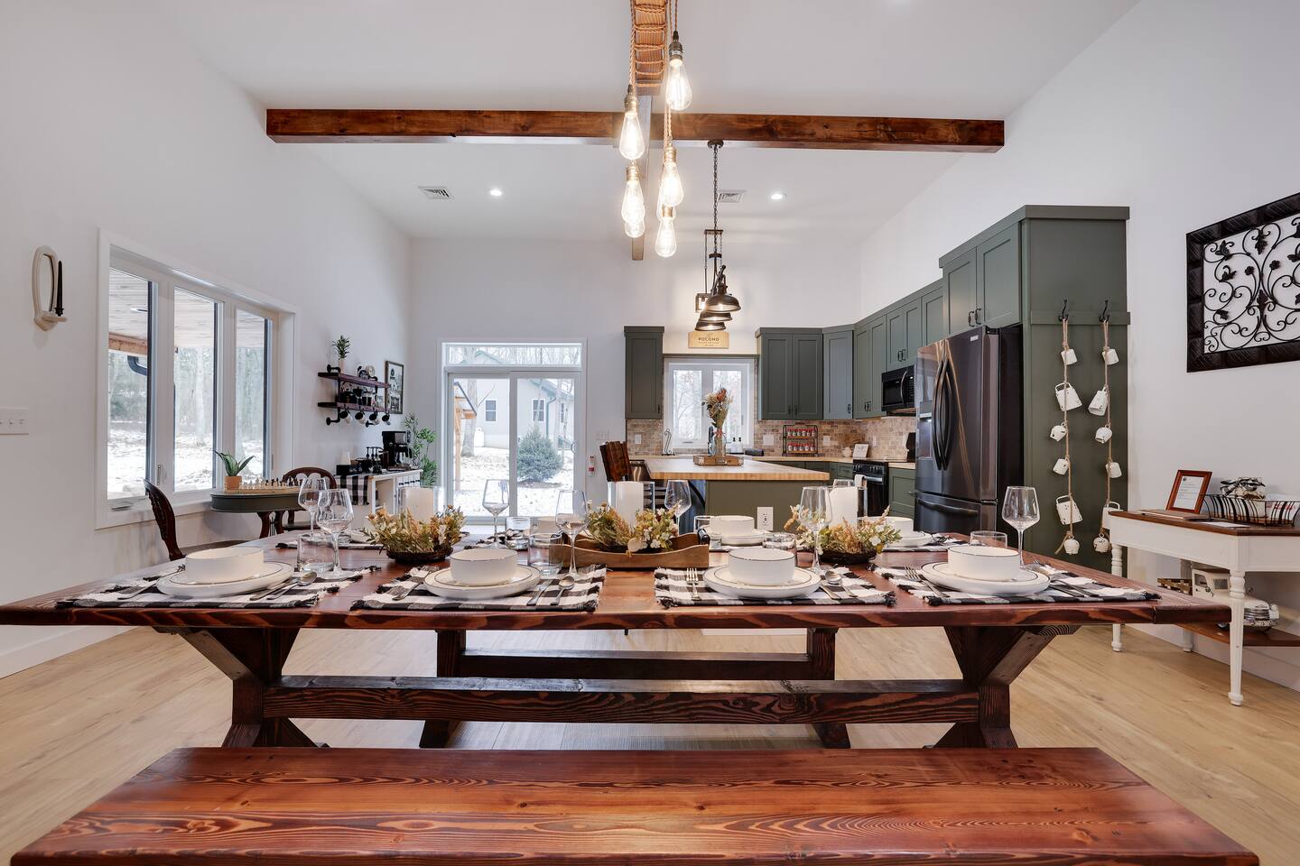 ✔ Dining: Custom wood table seats 8–10; kitchen island seats 4. Ask us about our private chef services!
