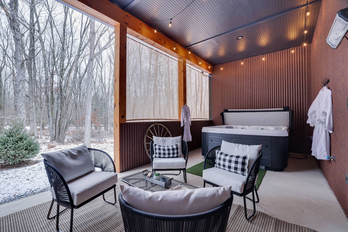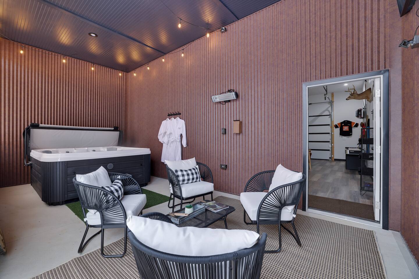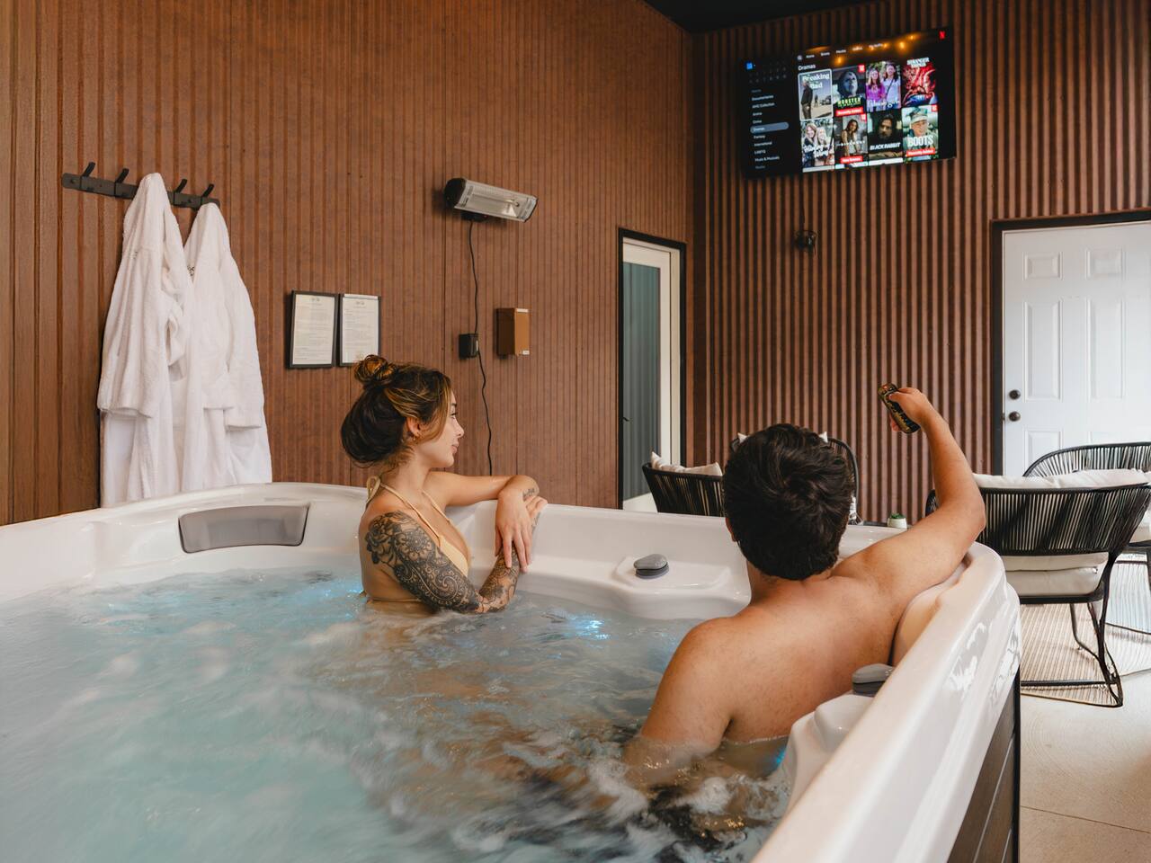 ✔ 7 PERSON HOT TUB: Covered hot tub 🌟 w/ 65” Smart TV, string lights, infrared heater & plush robes. Open year-round!