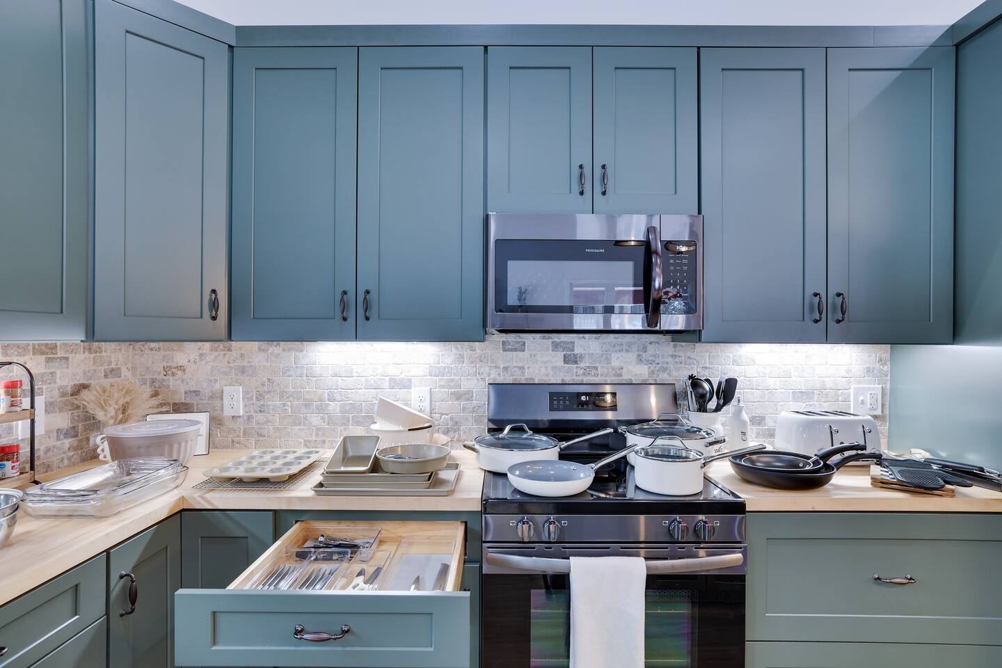 ✔ Brand New Custom Kitchen: fully stocked for home chefs 👩🍳 essential pots, pans, plates, cups, silverware, cooking utensils, basic spices, olive oil, cooking spray, wine glasses, crockpot, blender, baking sheets, hand mixer, oven, electric stove, dishwasher, refrigerator, toaster, microwave and wine cooler 🍳 🍷.