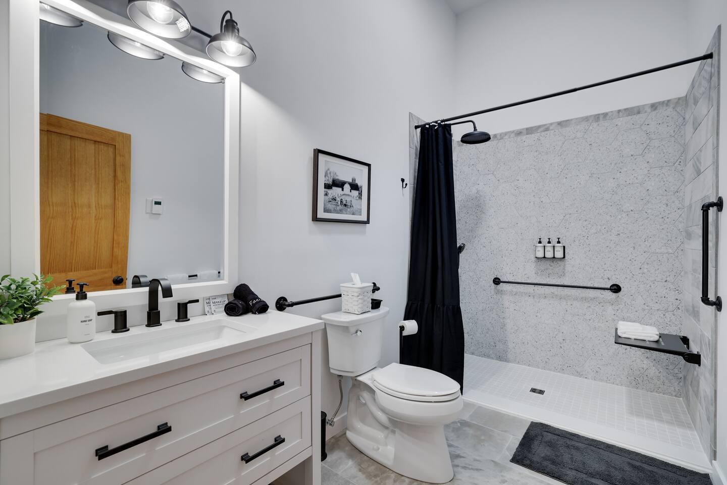 ✔ BATHROOM #2: ADA approved, handicap accessible, chair height toilet, grab bar behind toilet, grab bar on the wall going into the shower, grab bar in shower area, fold down seat and hand shower.